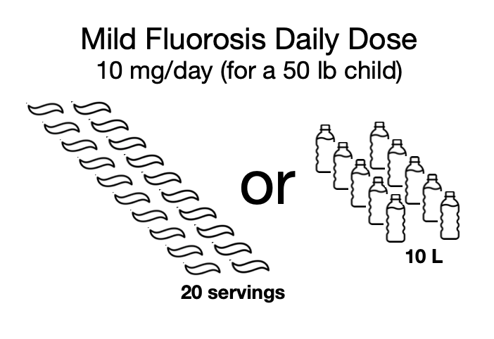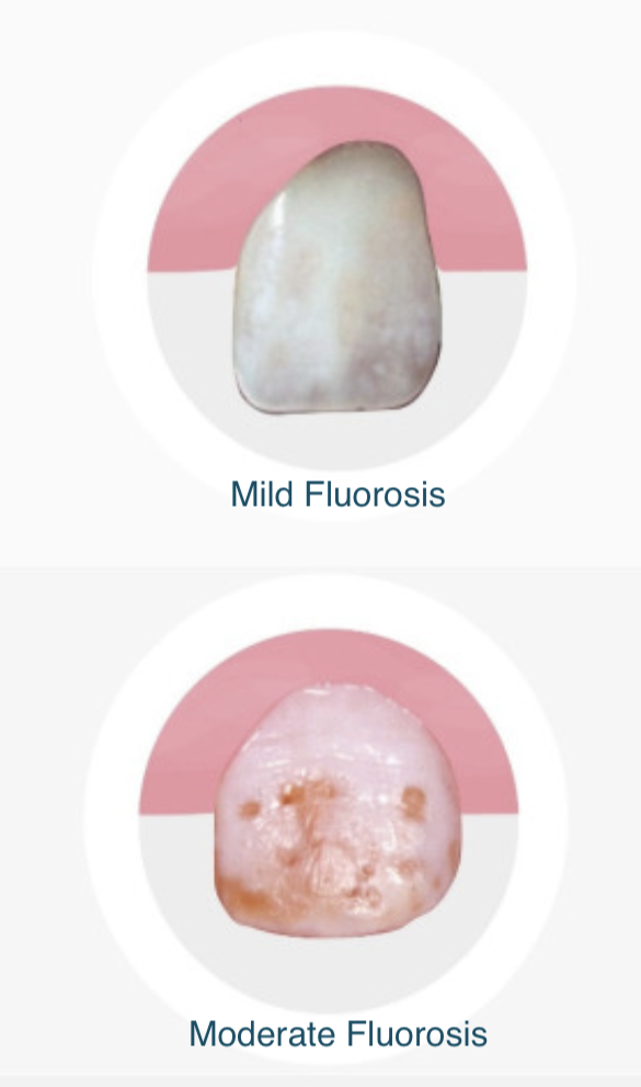 Moderate and severe flourosis requires excessive fluoride intake for extended periods of time and is frequently linked to excessive naturally occuring fluoride. It was first noticed in children growing up on well water in Colorado Springs, CO. The correlation between a lower incidence of decay and these brown spots it what lead scientist to explore water fluoridation for public health purposes!