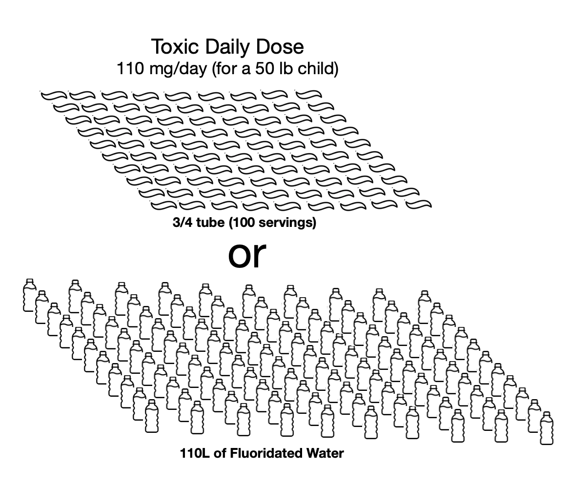 Fluoride at the recommended concentrations (0.7 mg/L) used in community water fluoridation is not harmful or toxic. The single dose (consumed at one time) of fluoride that could cause acute fluoride toxicity is 5 mg/kg of body weight. This dose is considered the probably toxic dose which "is defined as the minimum dose that could cause serious or life-threatening systemic signs and symptoms and that should trigger immediate therapeutic intervention and hospitalization." Acute fluoride toxicity from the ingestion of fluoridated water is impossible. With water fluoridated at 1 mg/L, an individual would need to drink five (5) liters of water for every 2 lbs of body weight. For example, a 150 lb adult would have to consume more than 330 liters (nearly 93 gallons) of water at one time to reach an acutely toxic fluoride dose.